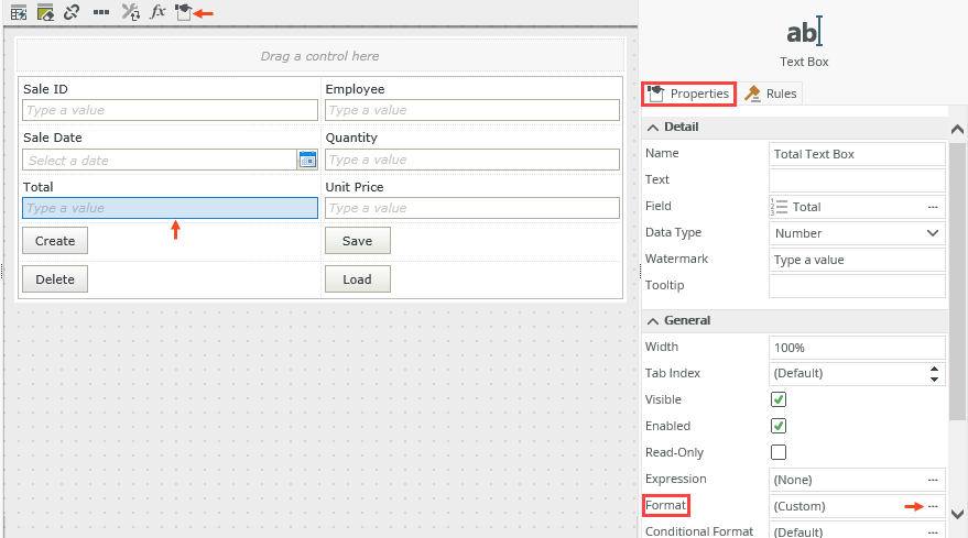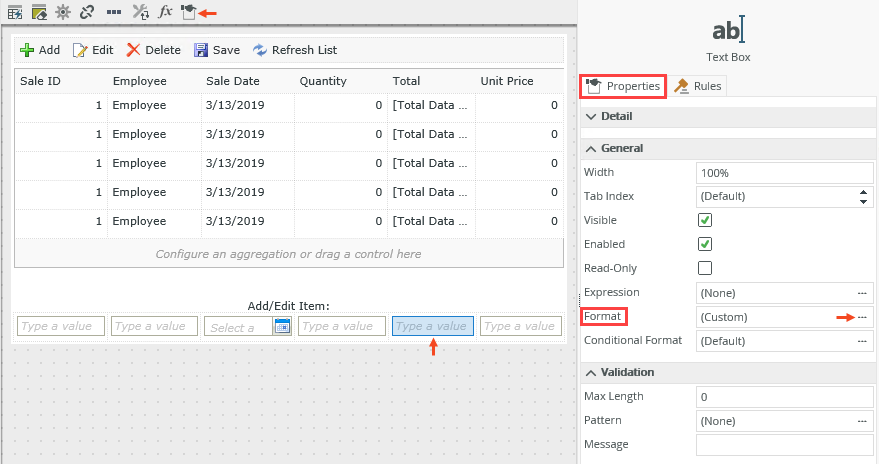 Select a control on the view in the Add/Edit Item section on the canvas and click the ellipsis next to Format in the Properties tab on the right, or click the Edit Format icon in the toolbar as shown below.