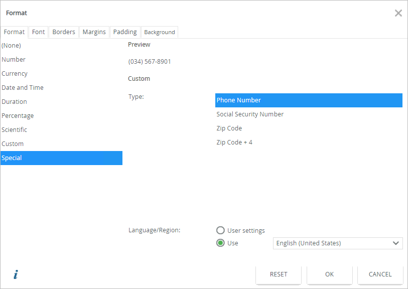 | Special | Applies special formatting to the control. You can specify a Language/Region and type. |