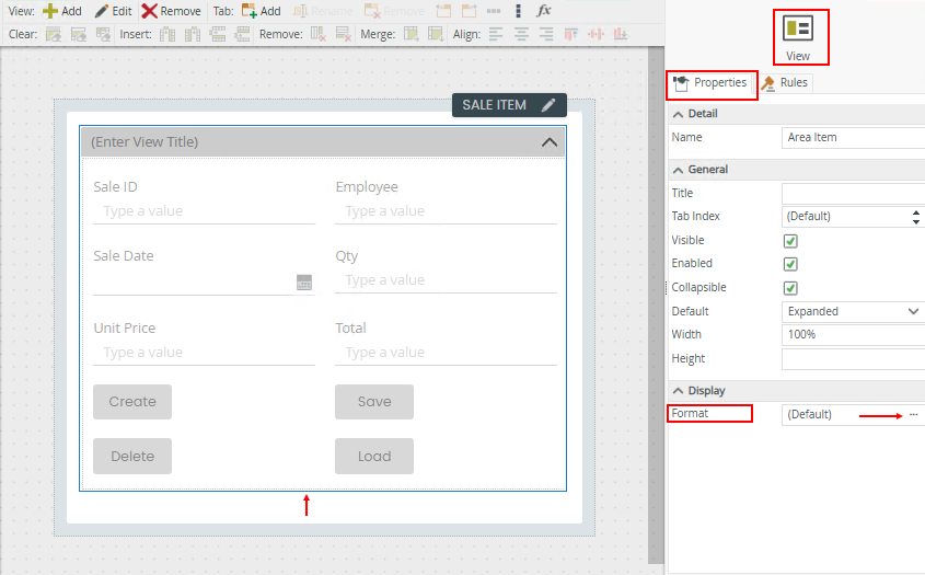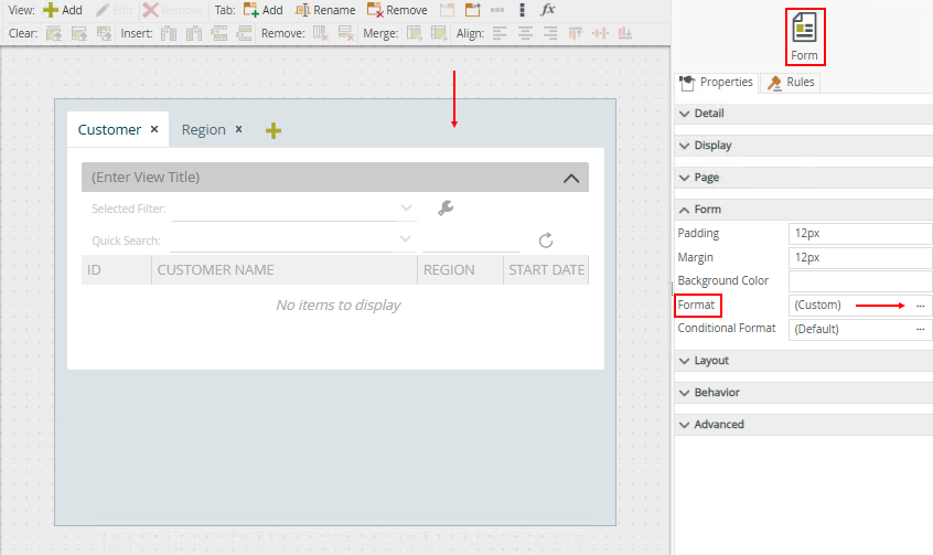 To configure the format of a view on a form, select a view and click the Format ellipsis in the Properties tab on the right. Note the View icon as shown in the image below.