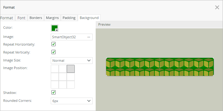 Background controls configure the background CSS properties of a table or form. You can configure the background color, background image, shadow, and rounded corner properties.