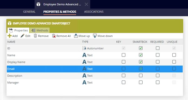 SmartObject properties define the data 'fields' of the SmartObject, similar to columns in a database or spreadsheet. SmartObject properties are most often associated with data required by, or returned by, SmartObject methods. This is known as binding: you 'map' or 'bind' a field returned by a method, to a property of that SmartObject. When editing a SmartObject in advanced mode, you can edit the properties for that SmartObject in the Properties tab, as shown below: