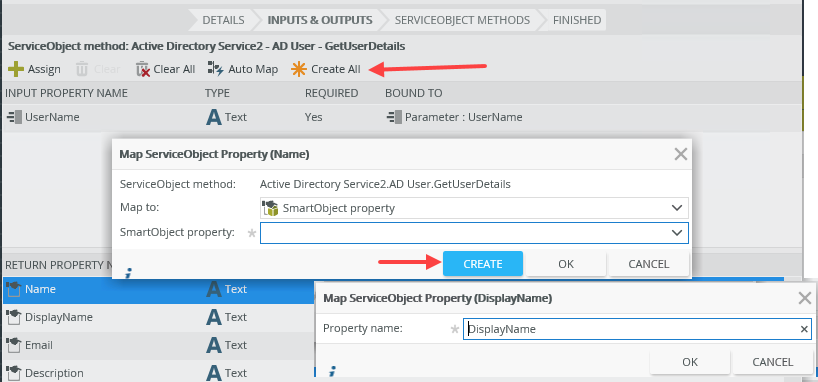 - During Service Object configuration: Create properties using the service object methods configuration screens. Create properties individually by clicking the Create button on the Map ServiceObject Property dialog, or automatically create all properties by clicking the Create All button. Selecting Create All automatically creates SmartObject properties for the service object properties that do not already exist and automatically creates a mapping for each property.