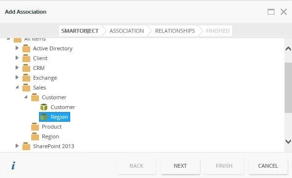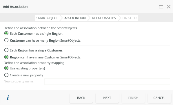 The Add Association wizard allows you to configure mappings between the properties of two SmartObjects (or between a SmartObject and a workflow) When you create the association, the wizard guides you through the necessary steps. If necessary, the wizard creates a SmartBox service object that contains the mapping information that allows data from the secondary SmartObject to be returned when you call a method in the main SmartObject. Click Add in the Associations tab of a SmartObject to open the Add Association wizard, which contains the following four pages: SmartObject, Association, Relationship, Finished.
