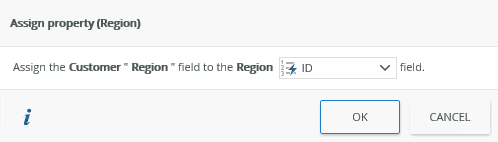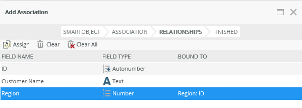 Use the Relationships page to configure the property mappings between the SmartObjects. The joining property joins the two SmartObjects for when you need data in a lookup for example and can be something like Region=Region:ID as shown in the following images. Select the source property (from the Customer SmartObject in this case) and click Assign to open the Assign property dialog. From the drop-down list select the property to map (ID from the Region SmartObject in this case), and then click OK. This configuration ensures that the region ID information is mapped to the Customer SmartObject, and region Name is returned with customer information.