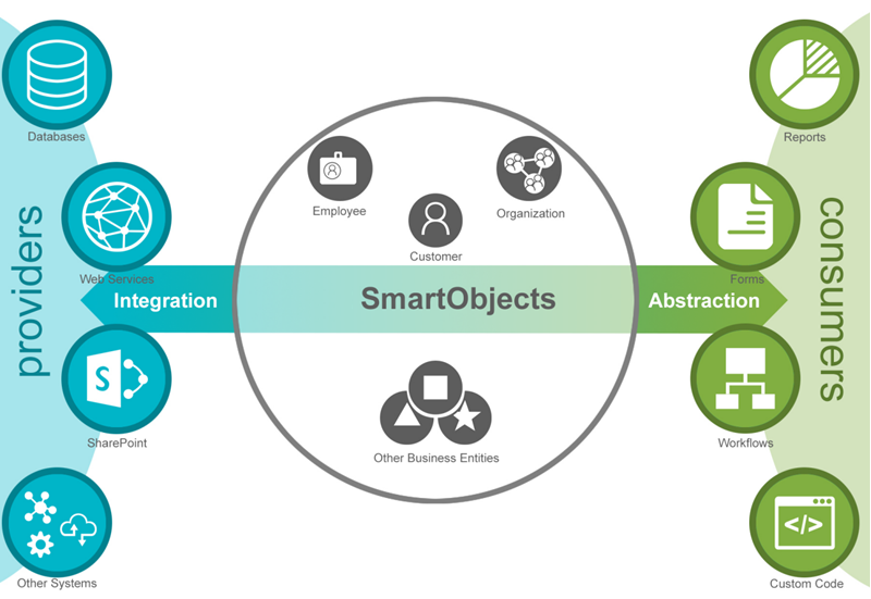 SmartObjects are business entities that represent data from applications and line of business (LOB) systems. They are a middle layer between data providers, such as SQL and SharePoint, and data consumers such as forms, workflows, reports, and code.