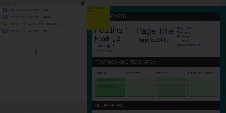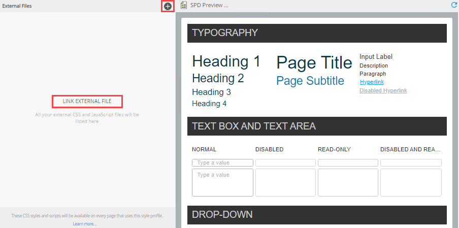 Add external CSS and JS files to your style profile by clicking Add or Link external file.