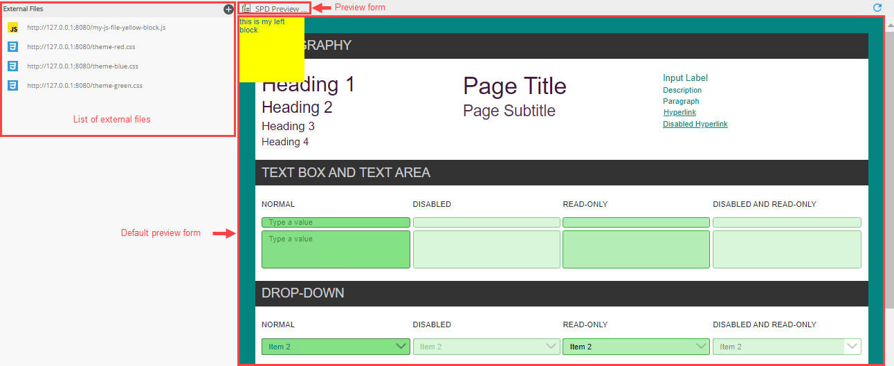 The preview pane contains a default form with some styling and controls to show the application of your changes in the linked CSS and JS files. You can use the default preview form or select your own SmartForm to test your changes in the Style Profile Designer. Click the SPD Preview button to select your own SmartForm for preview. The preview form includes the color changes you make in the Colors tab and the linked files in the Developer tab. The last three forms you opened show in the drop-down and you can choose to Reset to Default Form.