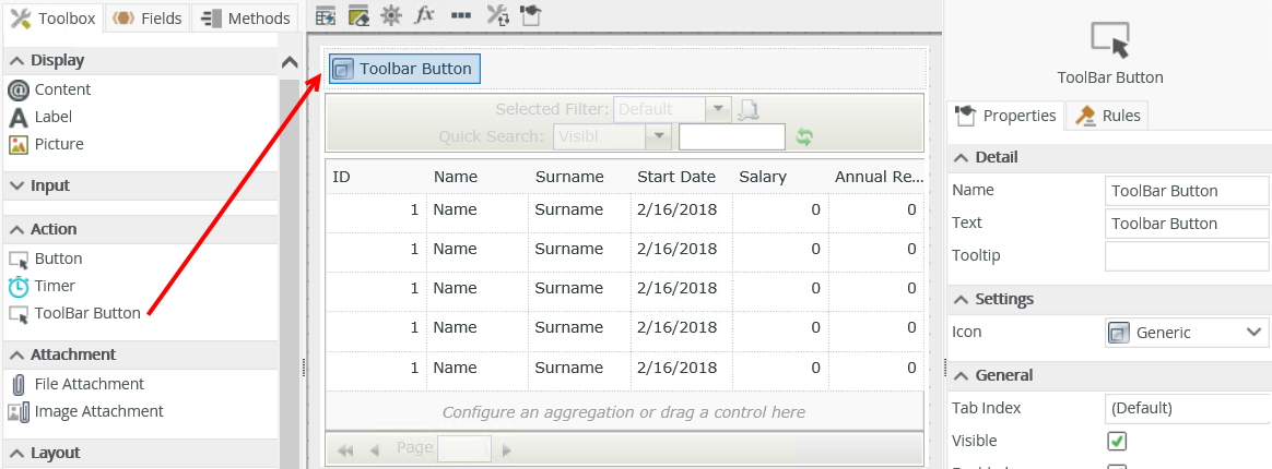 - Edit the List view and drag the Toolbar Button control onto the canvas. The control is available in the Action section of the Toolbox.