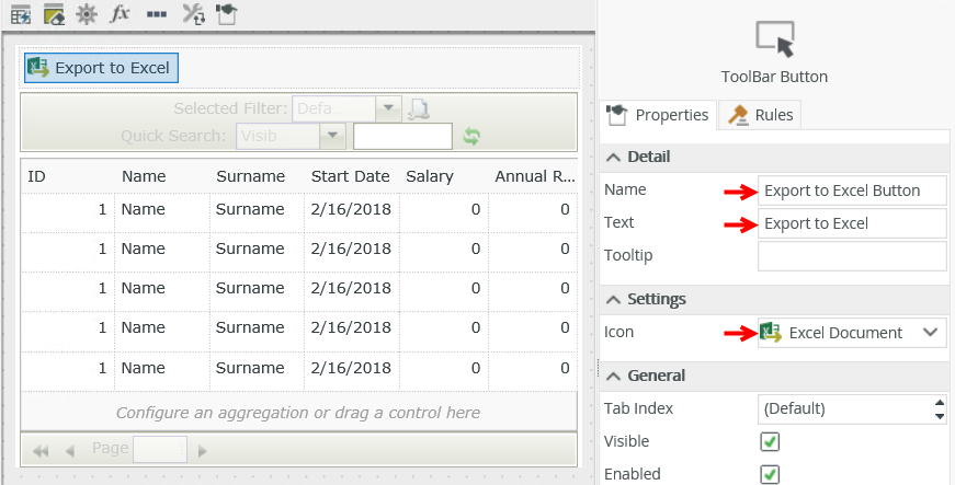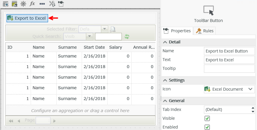 You can configure a control, such as the Toolbar Button control or standard Button control, to execute the Export to Excel action. When using the control at runtime, you click a button to save the view to an Excel file. At design time, you see a visual representation of the control that you use to configure it, including setting the number of rows (records) or all pages to export.
