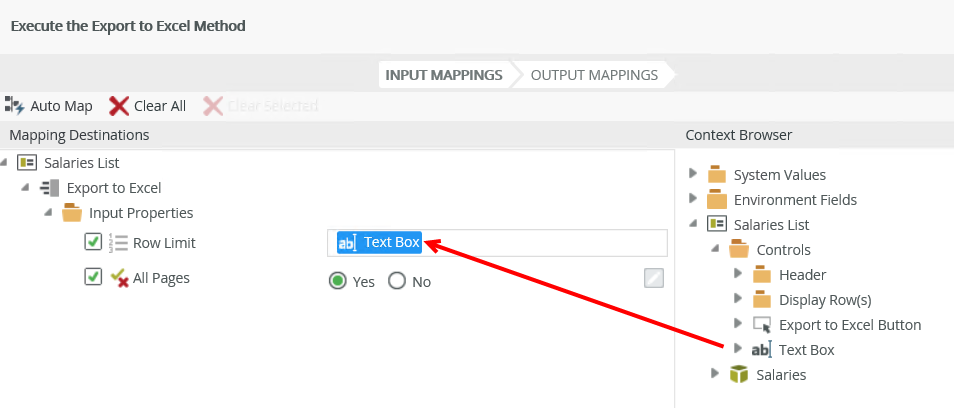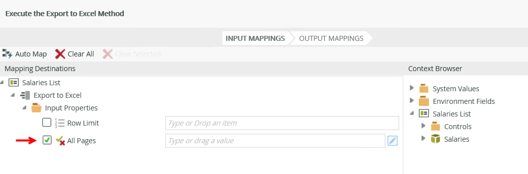 - When you configure the Row Limit and All Pages input properties of the Execute the Export to Excel method, the List view paging setting can impact what is exported.