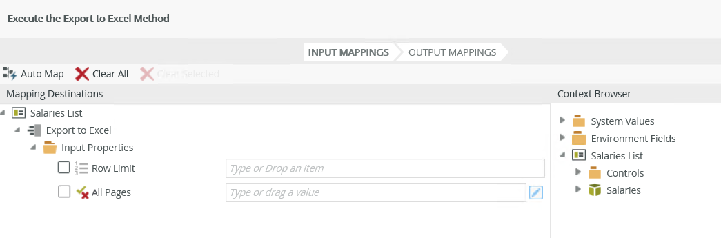 - Execute a method on the View: Exports the list to Excel. You can configure the input properties of the method to limit the number of rows exported and specify if all pages are to be exported.