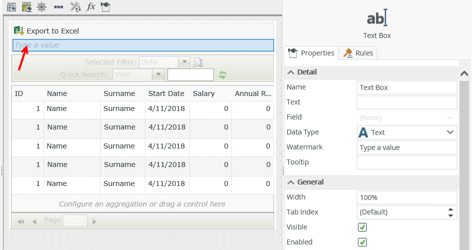- Drag a Text Box control onto the canvas.