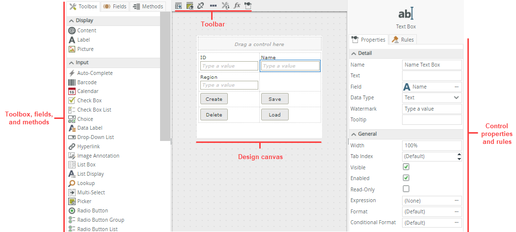 - Toolbox, Fields, and Methods - Drag controls, fields and methods onto the canvas to design your view. You can also bind more than one control to the same field. See the Binding Controls topic for detail and considerations when binding controls.