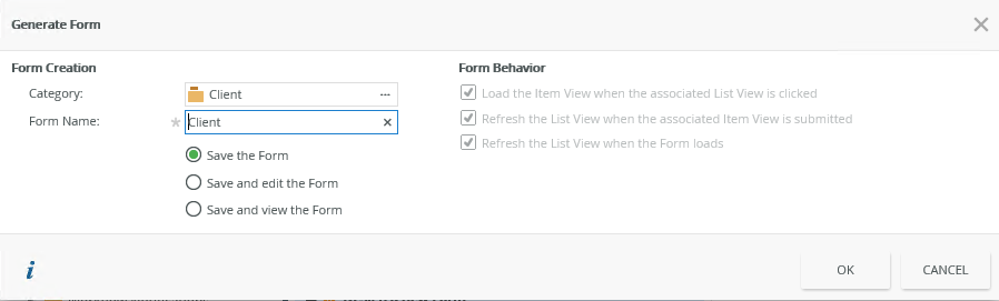 | Form Behavior | Determines the rules to create for the form | Select the options you need |