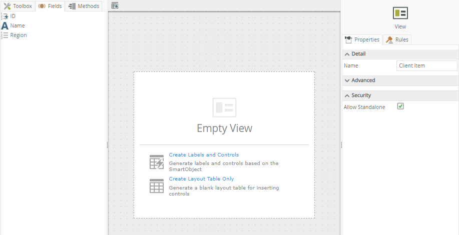 You have two options when the view is empty: You can Create Labels and Controls based on the SmartObject you selected on the General tab, or you can generate a blank layout table for inserting controls. If you want to get back to an empty view, click the Clear canvas button in the toolbar.