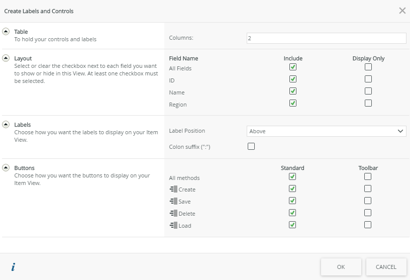 Selecting the first option, Create Labels and Controls, allows you to specify the details for creating the table, layout, labels, and buttons. Clicking OK automatically generates the view.