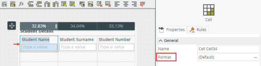 When you select a cell within the table, you can adjust the width of the column by entering a percentage value for the Width property. You can also change the background color and apply padding to a cell by using the Format property.