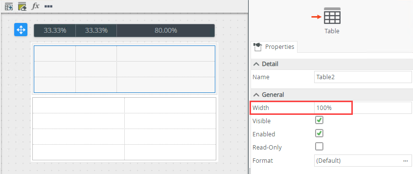 - The table width determines the runtime display, all columns in the table are automatically recalculated by the web browser at runtime to fit the specified table width.