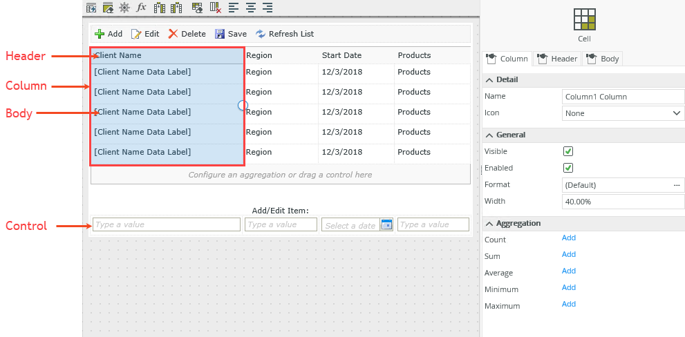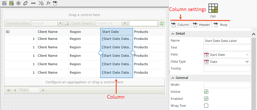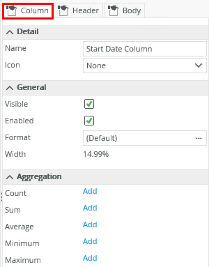 Column, Header, and Body, to configure settings such as width, aggregation, style, format, expressions, and more. Use the image below to familiarize yourself with the available column settings.