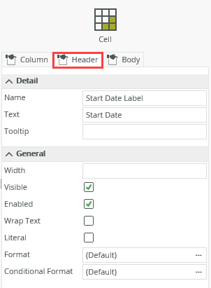 | Enabled | Indicates if you can use the header, for example to sort a column at runtime by clicking on the header. | Uncheck the option if the header should not be enabled |
