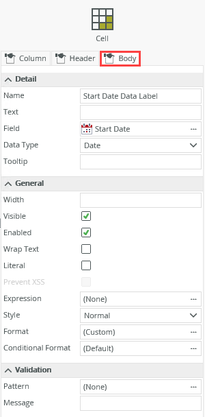 Use the Body settings to configure items such as the data type, width, expressions, and more. These settings apply to the rows of the column.