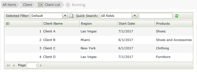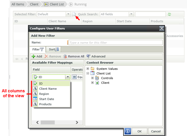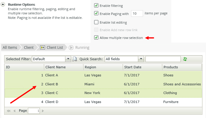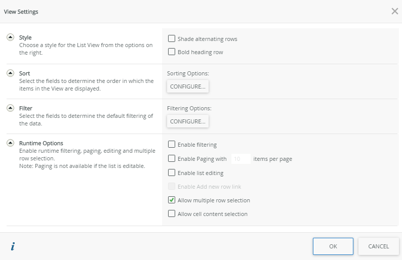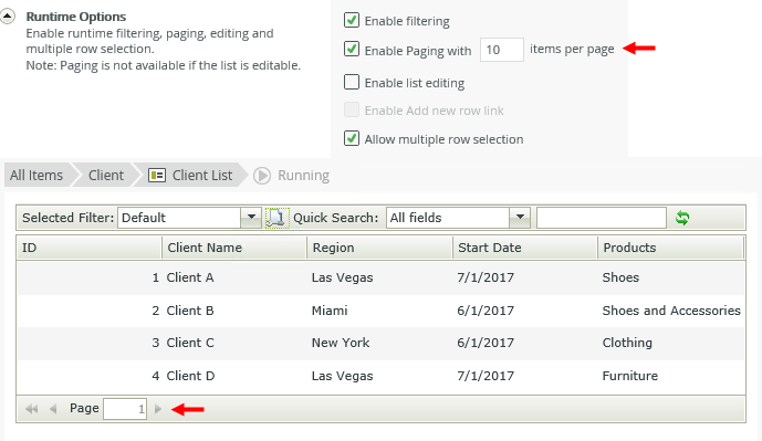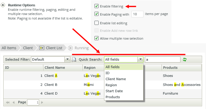 You can enable filtering, paging, list editing, and multiple row selection from this section. When you select to enable filtering, a Quick Search is added to your List view. The All fields item shows all visible