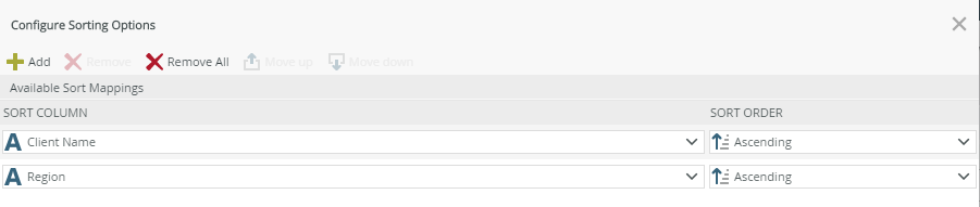 When you click Configure in the Sort section, the Configure Sorting Options page opens. You can select up to two fields