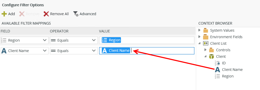 the filtering of the list data. You can type a value or use the Context Browser to drag and drop a value in the Value field.