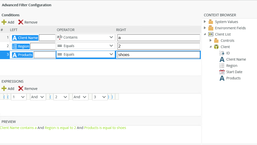 When you click Advanced on the Configure Filter Options page, the Advanced Filter Configuration page opens. You can configure advanced expressions such as the one shown in the image below. When you use fields to filter data, you must match the value on the right side with the data type of the SmartObject field. For example, the region ID of 2 filter matches the data type of the ID field, which is number. The filter would not work if you specified a region name using text or a field containing text.