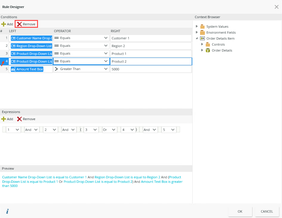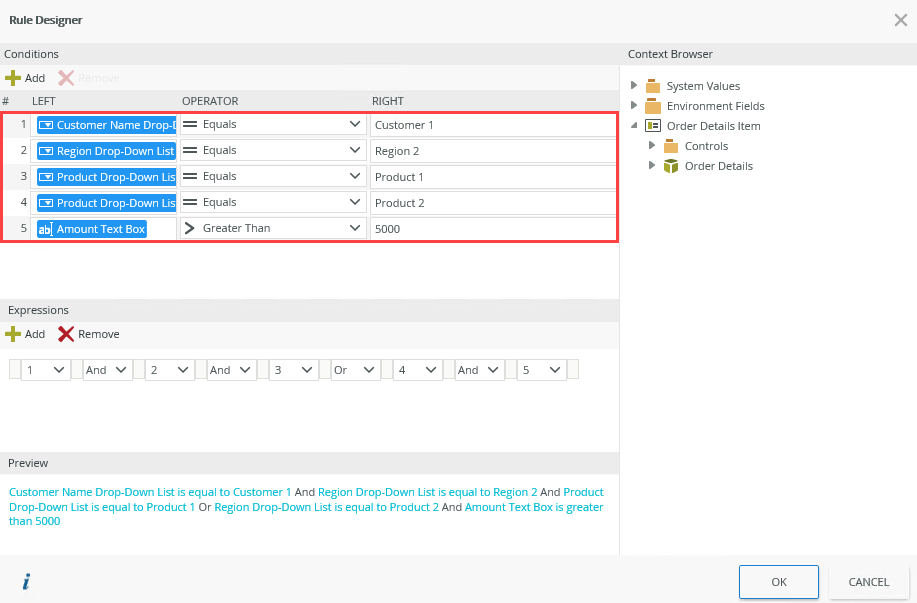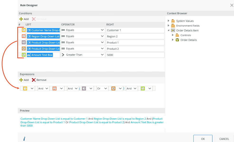 Example 3: Expression with multiple conditions allows you to build complex logic in your condition, including the ability to use logical Ands and Ors as well as parentheses around two or more conditions to determine the order of evaluation.