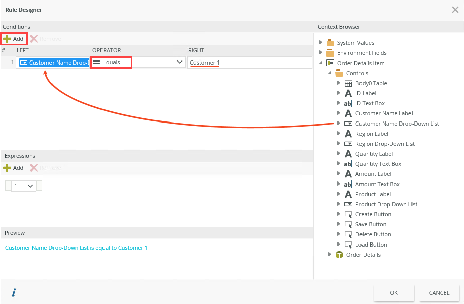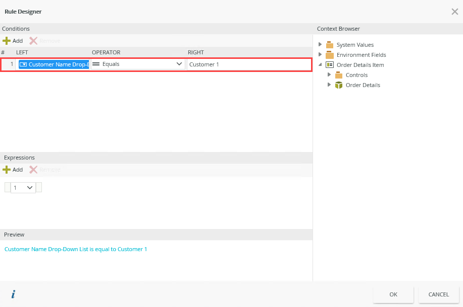 Example 2: Expression with a single condition evaluates the value of a control. If the control's value does not match the condition, the actions are not taken.