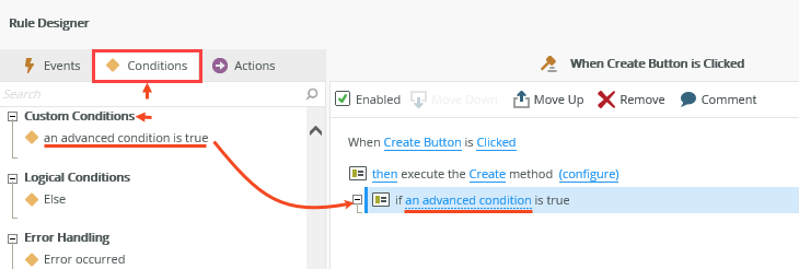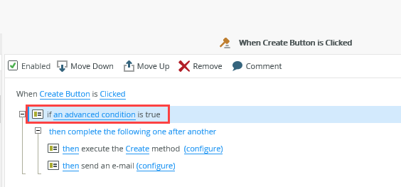 You can use the an advanced condition is true rule condition to execute an action if the condition is true, such as send an email if a control contains a specific value. You can also build advanced expressions and control how they are evaluated when using multiple conditions.