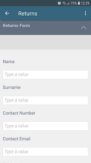 An existing Returns form allows customers to return products is made available in the Workspace (Mobile) app. This is done by setting the Application Form option at design time.
