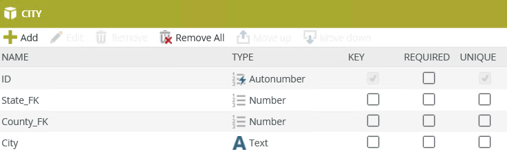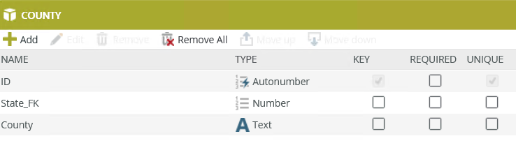 Properties Type Key Required Unique ID Autonumber Yes No Yes State_FK Number No No No County_FK Number No No No City Text No No No - From the Designer, create the County SmartObject as shown below.