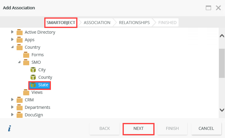 - On the SmartObject tab of the Add Association page, browse to the State SmartObject. Select it and click Next.