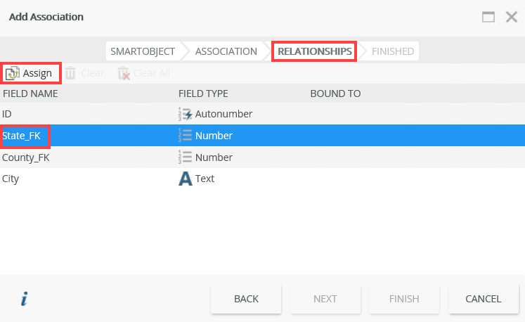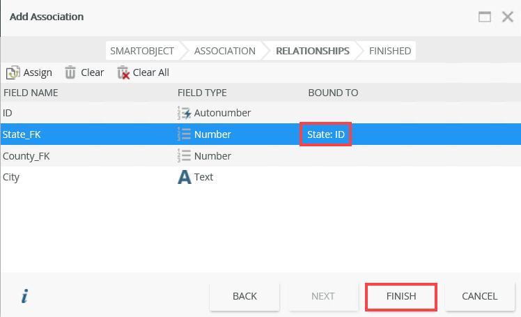 - The Bound To field shows the association between State_FK and State:ID. Click Finish.