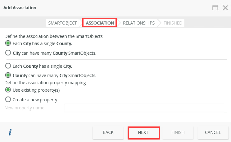 In this step, you create the associations between the City and State SmartObjects and between the City and County SmartObjects.