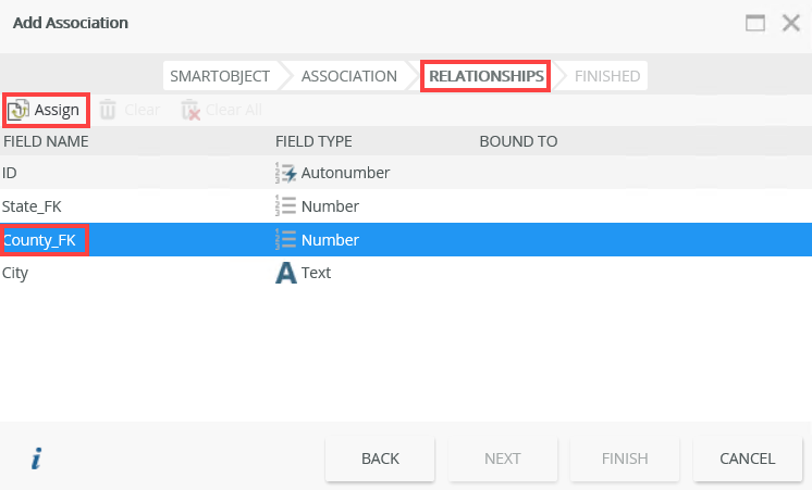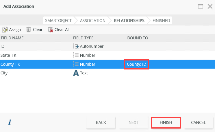 - The Bound To field shows the association between County_FK and County:ID. Click Finish.