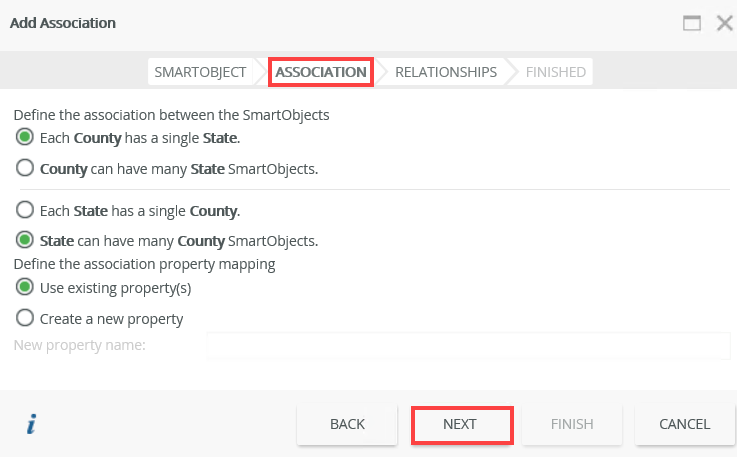 - On the SmartObject tab of the Add Association page, browse to the County SmartObject. Select it and click Next. On the Association tab, make sure the associations are defined as shown below. Click Next.