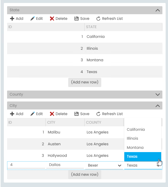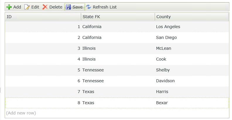 State_FK County California Los Angeles California San Diego Illinois McLean Illinois Cook Tennessee Shelby Tennessee Davidson Texas Harris Texas Bexer - The completed County list view.