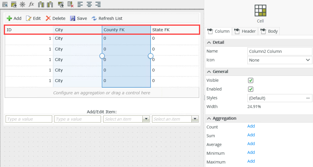 - Click and drag to rearrange the columns, on the layout, in this order: ID, City, County FK, State FK.