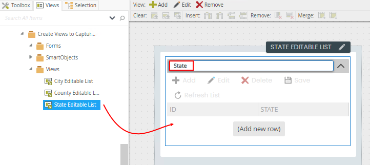 - From the Views tab, click and drag the State Editable List view onto the canvas. Change the view title to State.