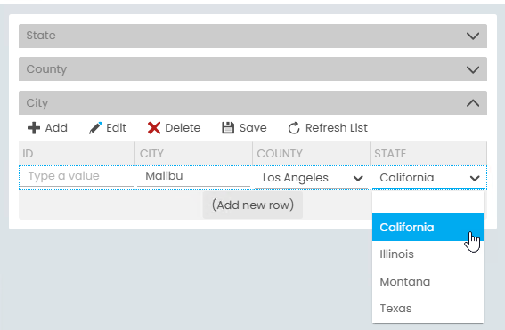 - In the new row, type Malibu in the City field, select Los Angeles from the County drop-down and California from the State drop-down. Click Save.