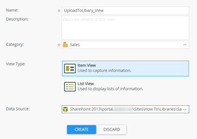 2. Create an application with Data (artifacts) for your document library. This creates the SmartObjects needed to upload the file. See Creating an Application Through a List or Library for the steps to create artifacts for your library.