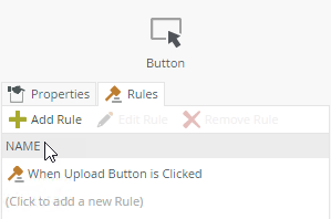 3. Add a Button control to your view and configure the button clicked Rule to use the Upload Document SmartObject of your SharePoint library.