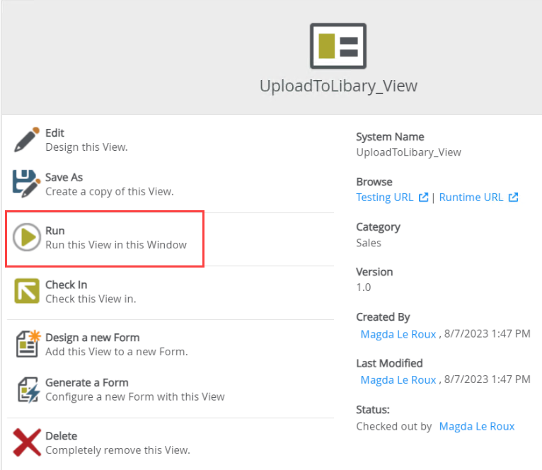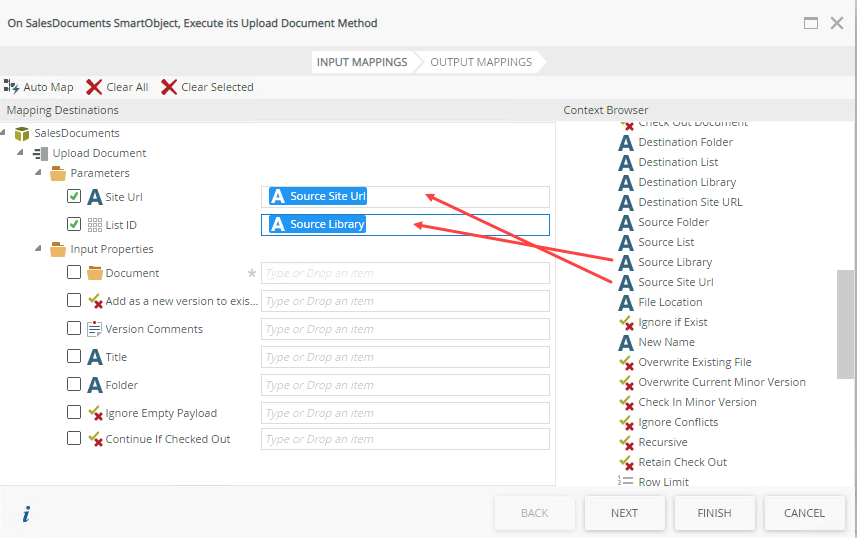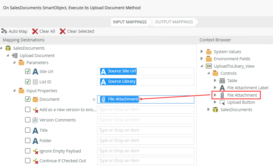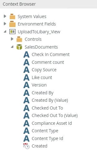 12. In the Context Browser expand the UploadToLibrary_View > SalesDocuments SmartObject.