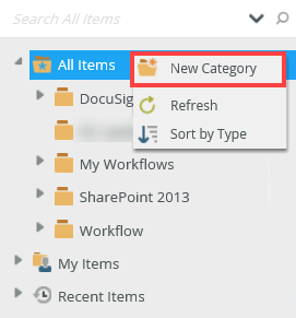 - From the Designer, locate and select the All Items folder. Right click and select New Category.