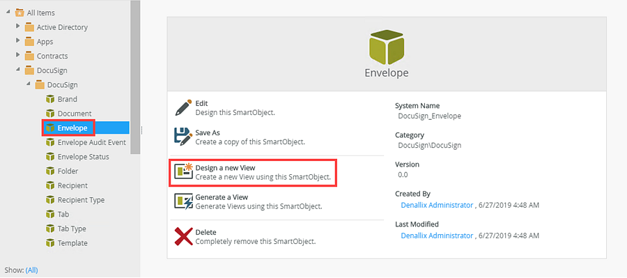 - Locate the Envelope SmartObject within the DocuSign category. Select Envelope and click the Design a new View option.