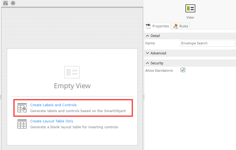 Next you add controls to the view and use them as search fields on the list view. Then you add a Drop-Down List control and configure it to use a SmartObject as a data source. From the list view you edit the Initialize rule to populate the list control with data. Next step you add a Search button control to the view and configure it.