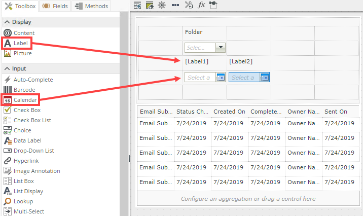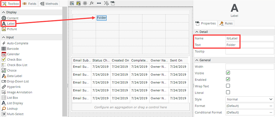 - Drag a Label control onto the canvas. The control is available in the Display section of the Toolbox. Change the label name to lblFolder (in the Name field) and Folder (in the Text field).
